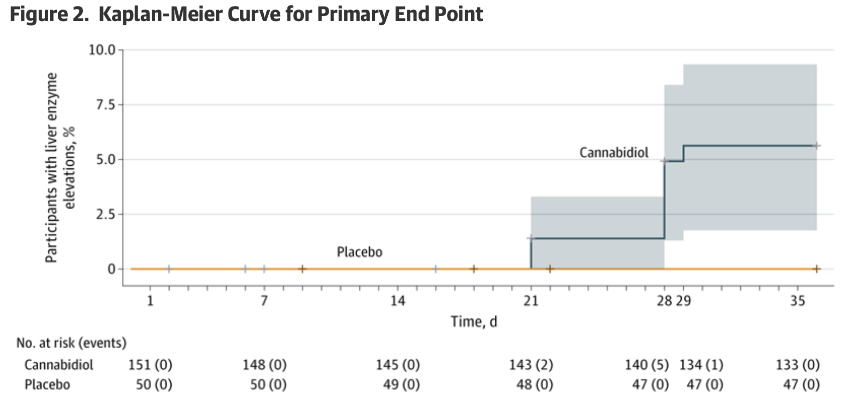 2. The main finding: “in this randomized double-blind clinical trial of healthy adults administered CBD, 5 mg/kg/d for 28 days, 8 (5.6%) experienced liver enzyme level elevations and 7 (4.9%) met protocol defined criteria for potential drug-induced liver injury.”