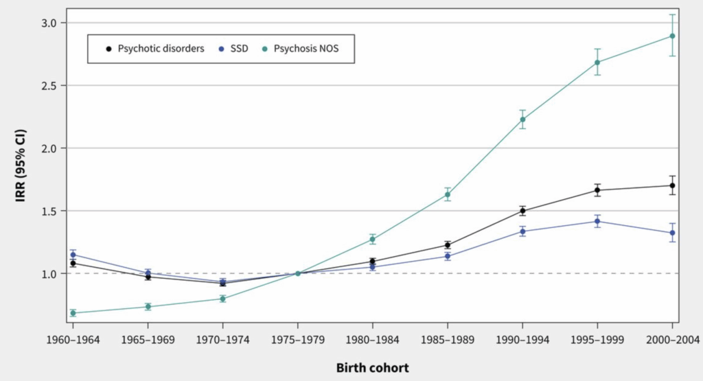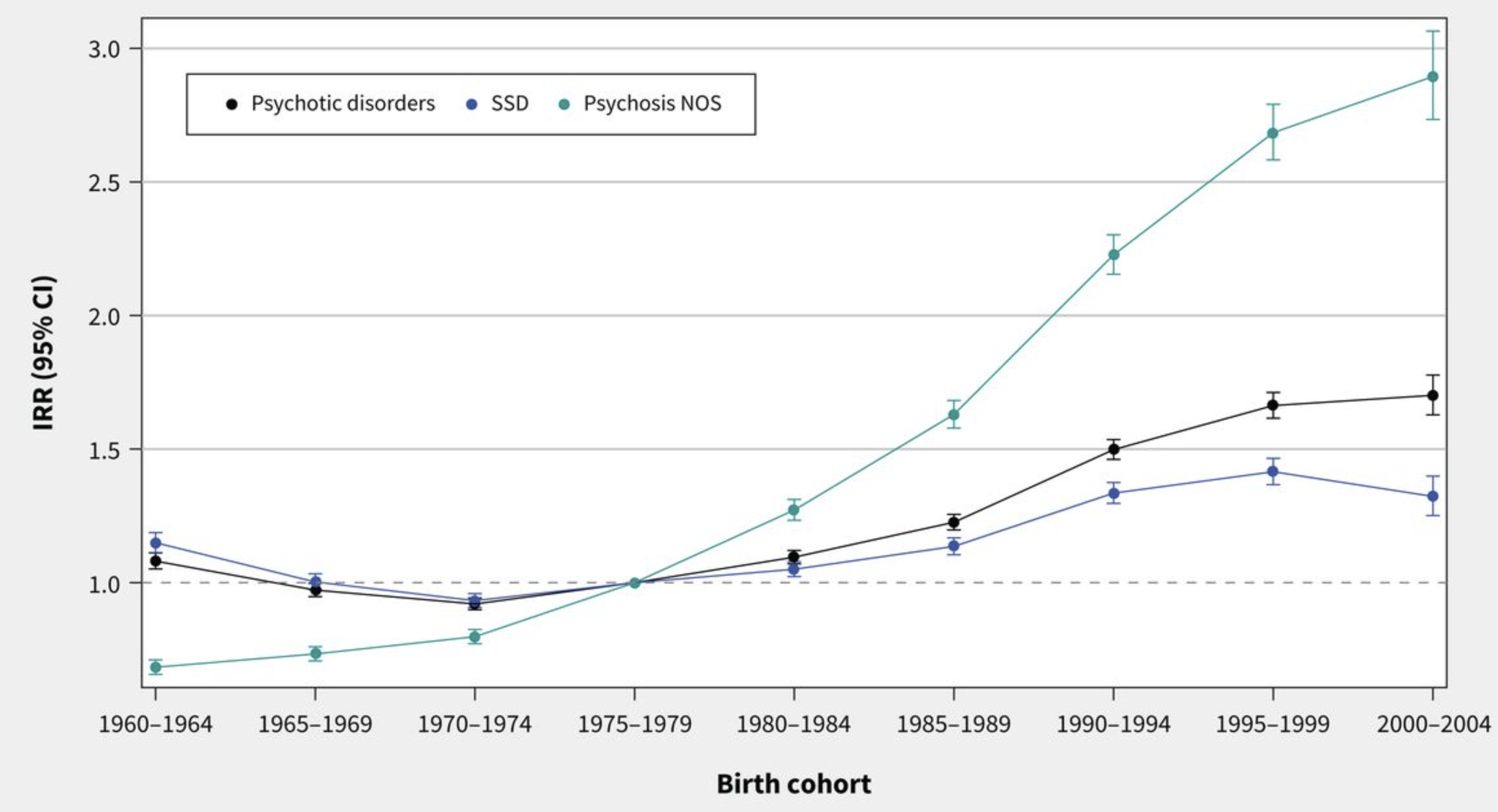 5. It’s a big finding. Is it too big? Studies drawing on North European data have found increases in the incidence of psychotic disorders in young people, but not quite so pronounced (speaking to differences in methodology, perhaps).