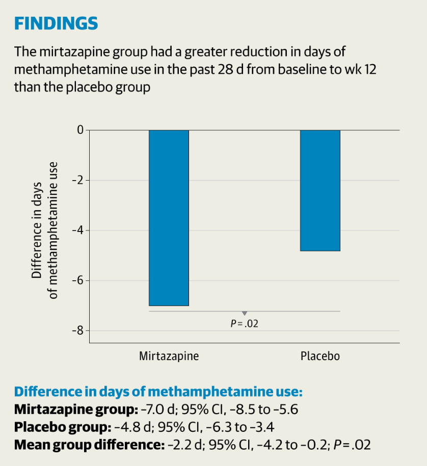 2. The main finding in a sentence: “In this randomized clinical trial, people with methamphetamine use disorder had a mean reduction of 7 days (out of 28 days) after 12 weeks of mirtazapine (30 mg/day) treatment, which was approximately 2 days more than the reduction seen with placebo.”