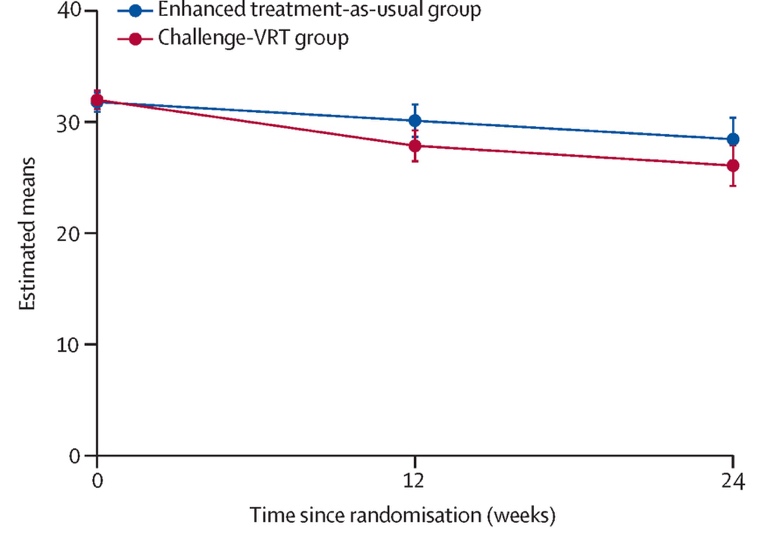 - Secondary outcomes. “A significant reduction in PSYRATS-AH frequency was observed in the Challenge-VRT group at both 12 weeks (adjusted mean difference –0.84…) and 24 weeks (adjusted mean difference –0.86…).”